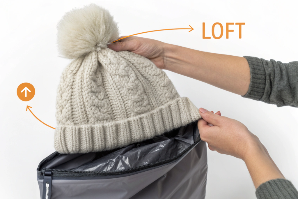 Think about it this way: when you put a thick, fluffy beanie into a flat bag, the bag has to stretch around the beanie. This stretching action "steals" from the bag's flat width. If you don't account for this, a bag that seems wide enough on paper will be too tight in reality.