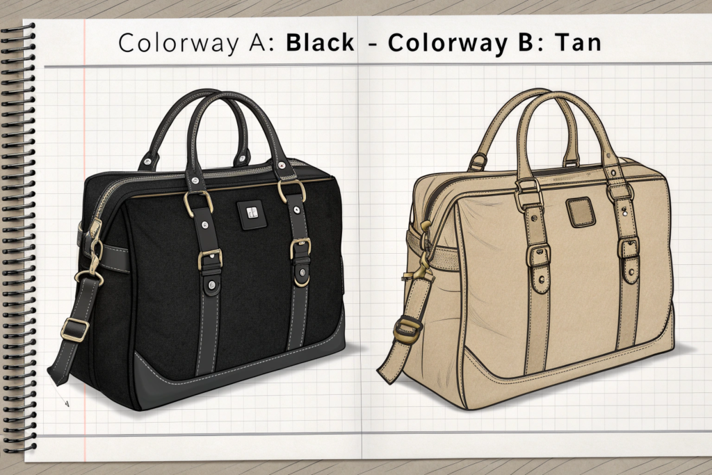 Your bag might come in three different colors for the season. How do you communicate that? You need a Colorway Specification Sheet. This is a separate page in your tech pack for each color version of your bag.