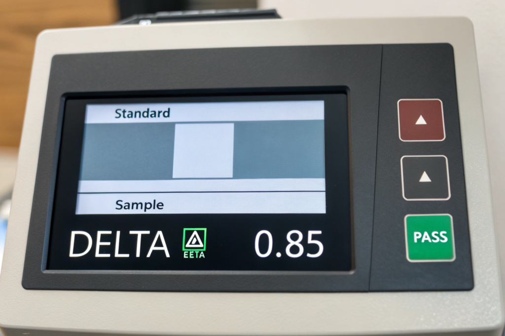 How can you remove human opinion from color approval? While visual approval is important, our eyes can be deceiving. The ultimate tool for professional color management is the spectrophotometer. This is a device that measures color by shining a light on a surface and reading the exact wavelength of the light that reflects off it. It translates color into a set of objective, numerical data (usually Lab* values).