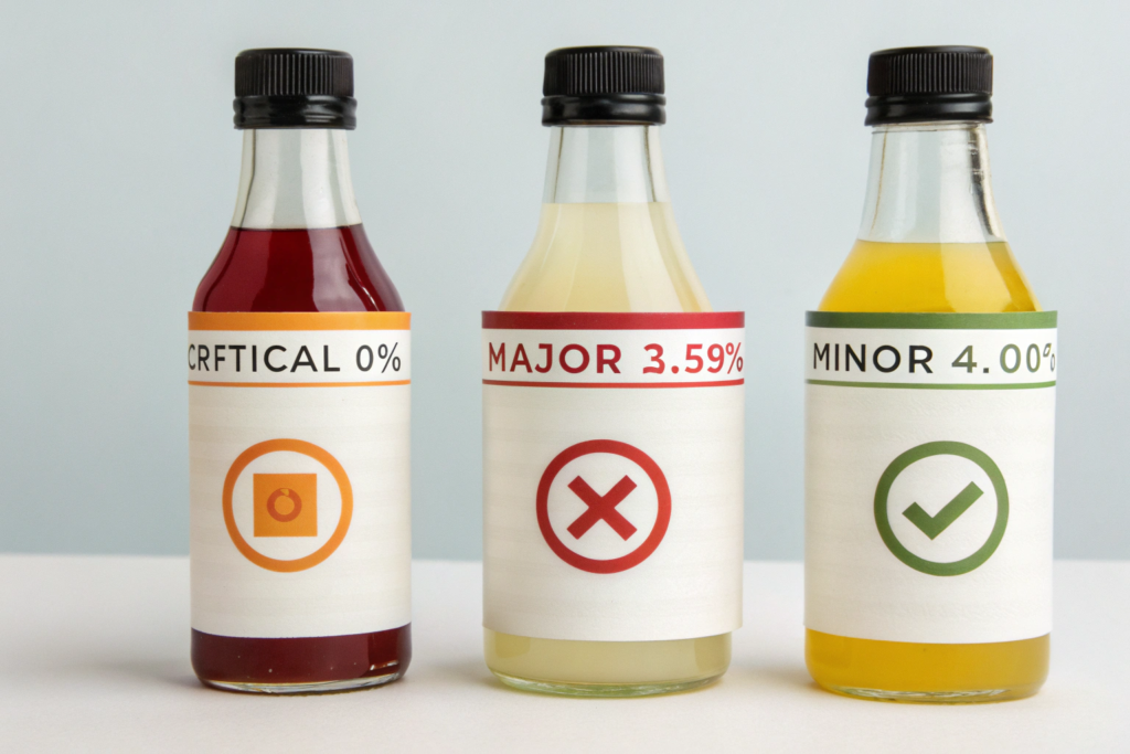 Before you can judge the results, don't you need to understand how defects are categorized? The entire report is built around a system called AQL (Acceptance Quality Limit), which classifies defects into three levels of severity. You, the client, decide the acceptable limit for each level. A typical setup is Critical 0%, Major 2.5%, and Minor 4.0%. Understanding what falls into each category is the first step to interpreting the report.