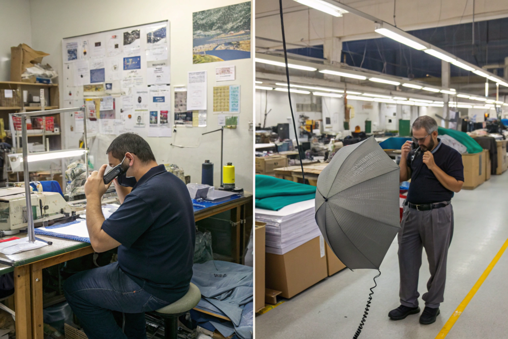 A real factory salesperson will say, "Give me one minute, let me walk to the sewing line." You will hear the noise of the factory. You will see the rows of sewing machines. You will see the stacks of umbrella canopies and the racks of metal frames. You will see workers in uniform.