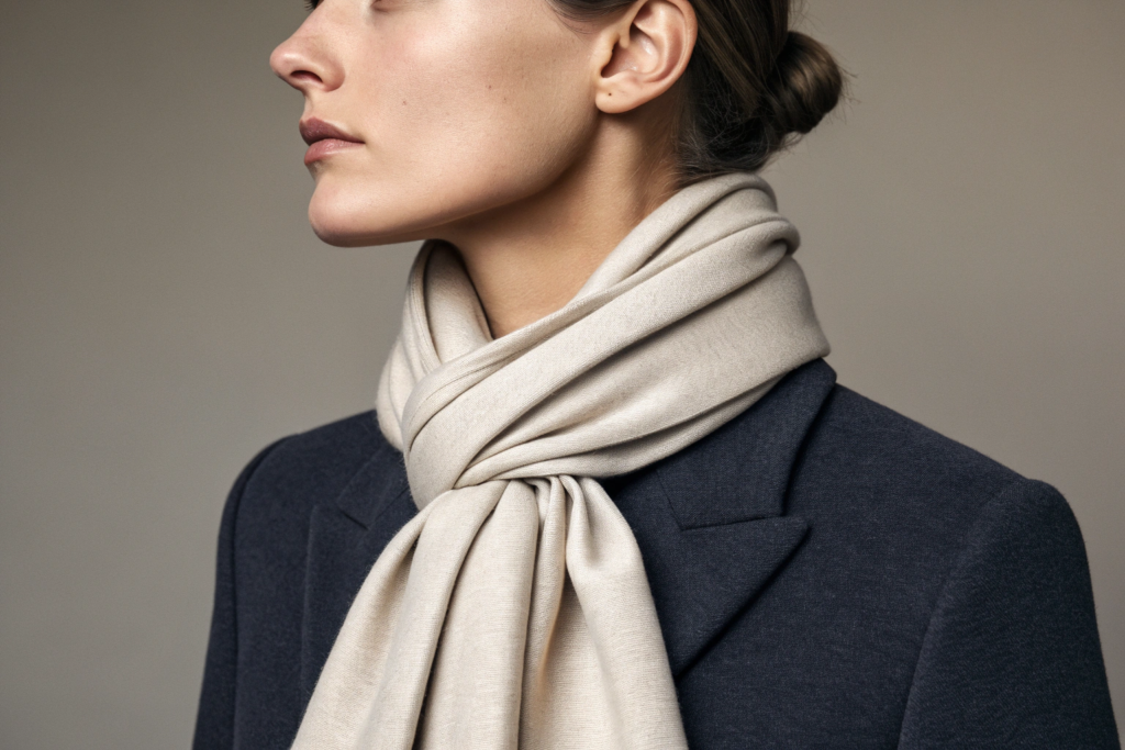 The most classic and essential knot for a folded scarf is the Parisian Knot (also known as the European Loop or French Knot). It is exceptionally easy to tie, looks sharp and intentional, and sits neatly under the collar of a coat or jacket. Its contained, vertical lines create a slimming effect and keep the scarf securely in place.