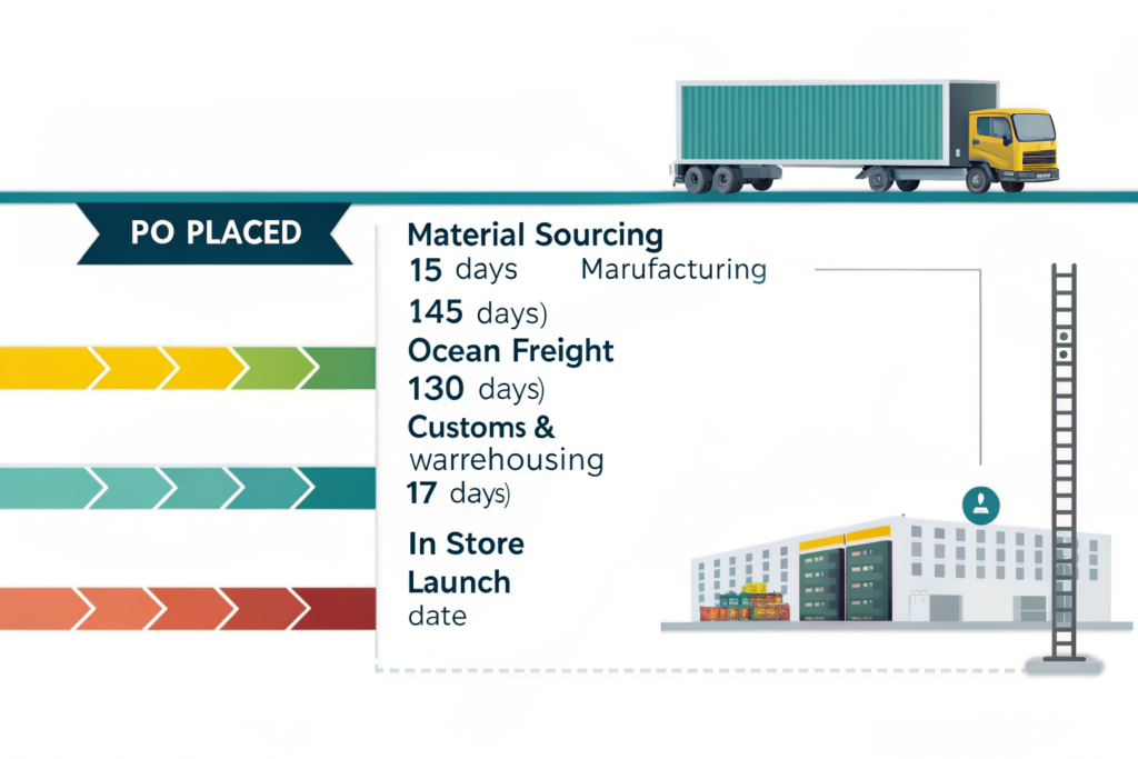 You must press "go" on bulk production no later than 4 months before your in-store launch date. This timing allocates a realistic window for manufacturing (typically 45-60 days) and logistics (30-45 days for ocean freight and customs clearance). Placing your purchase order any later than this introduces a high risk of missing your launch window.