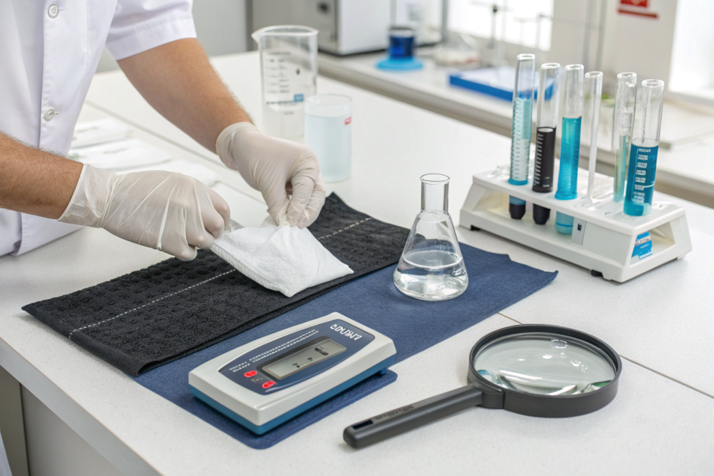 - Moisture Wicking Test: A simple vertical strip test, where one end of the fabric is dipped in water, shows how quickly and how far moisture travels along the fibers.