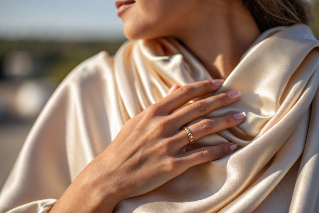 Silk is the classic choice for luxury shawls. And for good reason. It is soft. It breathes. It drapes beautifully. It feels amazing against the skin.