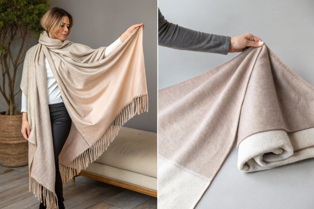 First, ask for a full sample shawl. Not a small swatch. A full-size sample. Put it on. Fold it. Move around in it. See how the lining behaves.
