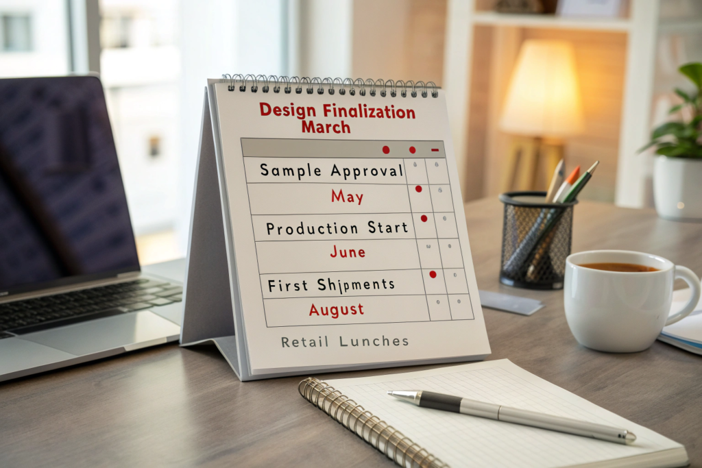 For the Northern Hemisphere holiday season (November-December), a successful timeline starts in January or February of the same year. This is when we begin discussions with our clients about their holiday concepts. By March, designs should be finalized and tech packs created. April to June is for sampling, revisions, and pre-production sample approval. July to September is the prime production window, allowing for shipments to leave China in August and September. This ensures goods arrive at retailers or warehouses in October, in plenty of time for holiday merchandising and early-bird shoppers. This timeline accounts for production, shipping, and any unexpected delays.