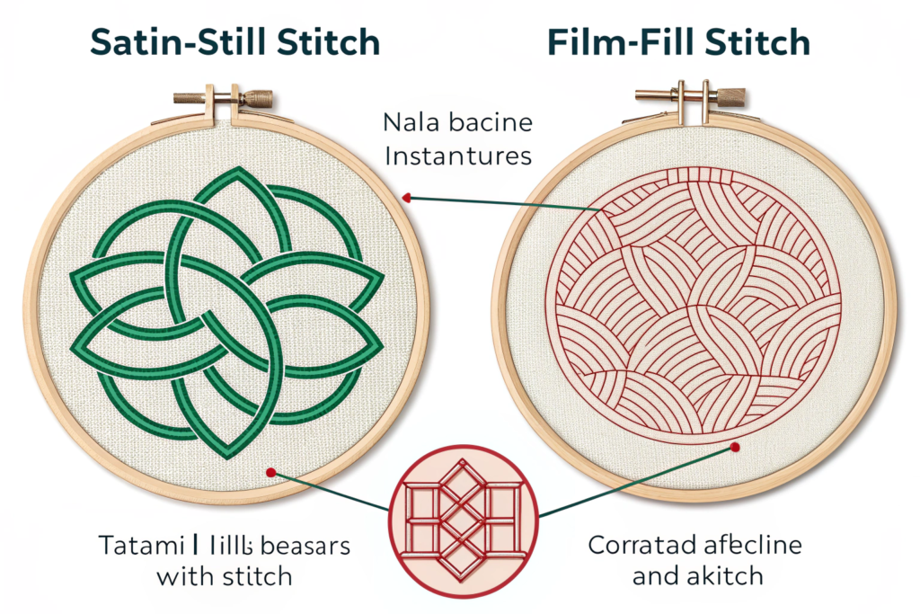 - Fill Stitch (Tatami): Used for covering larger areas (like a solid shape or background). It's a grid of intersecting stitches that run in alternating directions for stability and coverage. It has a flat, matte texture.