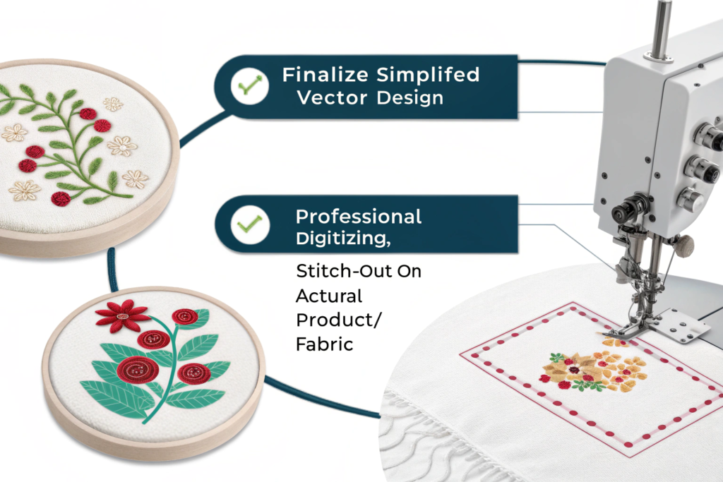 The final step before mass production is validation. Never approve an embroidery run based on a digital mockup alone. The process should be: Finalize Simplified Vector Design > Professional Digitizing > Stitch-Out on Actual Product/ Fabric.