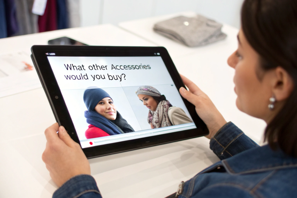 Ask, "What other accessories do you buy?" Ask, "What accessory do you wish we sold?" Ask, "Would you buy a scarf from us?" Ask, "What price would you expect to pay?" Keep it short. Offer a discount for completing the survey. We have a survey template for clients.