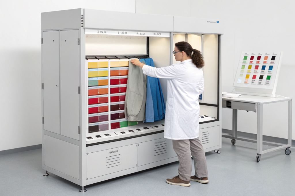 Recraft指令-- A clean, well-organized quality control lab setting. The image shows a color assessment cabinet with standardized D65 daylight simulation. A technician is comparing a dyed fabric swatch against a standard color pantone under the consistent light. Next to them, a tested fabric sample from a wash fastness test is drying, showing no staining on adjacent white fabric. The focus is on accuracy, comparison, and adherence to standards.