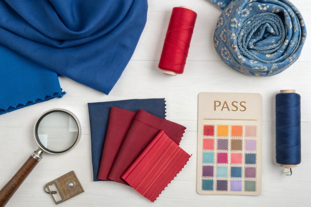 Recraft指令-- A flat lay composition of high-quality dyed fabric swatches for accessories. The image shows a range of textiles including a deep blue cotton for scarves, a vibrant red polyester for hats, a patterned silk, and a sturdy canvas for bags. Next to the fabrics are symbols of quality: a magnifying glass over a perfectly stitched seam, a test report with a "PASS" stamp, and a spool of high-grade thread. The lighting is bright and even, showcasing the rich, stable colors.