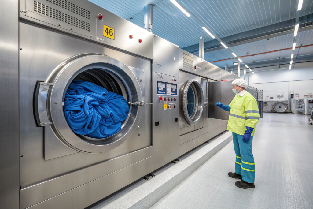 Recraft指令-- A photorealistic image inside a modern, clean industrial dyeing facility. The focus is on a large, computerized dyeing machine with a viewing port, showing fabric circulating in a vibrant blue dye bath. A technician in safety gear is monitoring the control panel displaying precise temperature and time settings. The atmosphere is high-tech, controlled, and professional, emphasizing precision in the dyeing process.