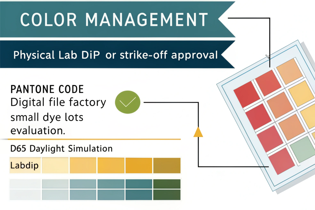 This process is called color management. It starts with providing a physical lab dip or strike-off approval. You send a color standard (a fabric swatch, Pantone code, or digital file), and the factory produces several small dye lots for your approval. You must evaluate these under consistent, standardized lighting (a light box with D65 daylight simulation) and not just under office lights or sunlight, which can distort perception. Only after you approve a lab dip should the factory proceed to bulk production.