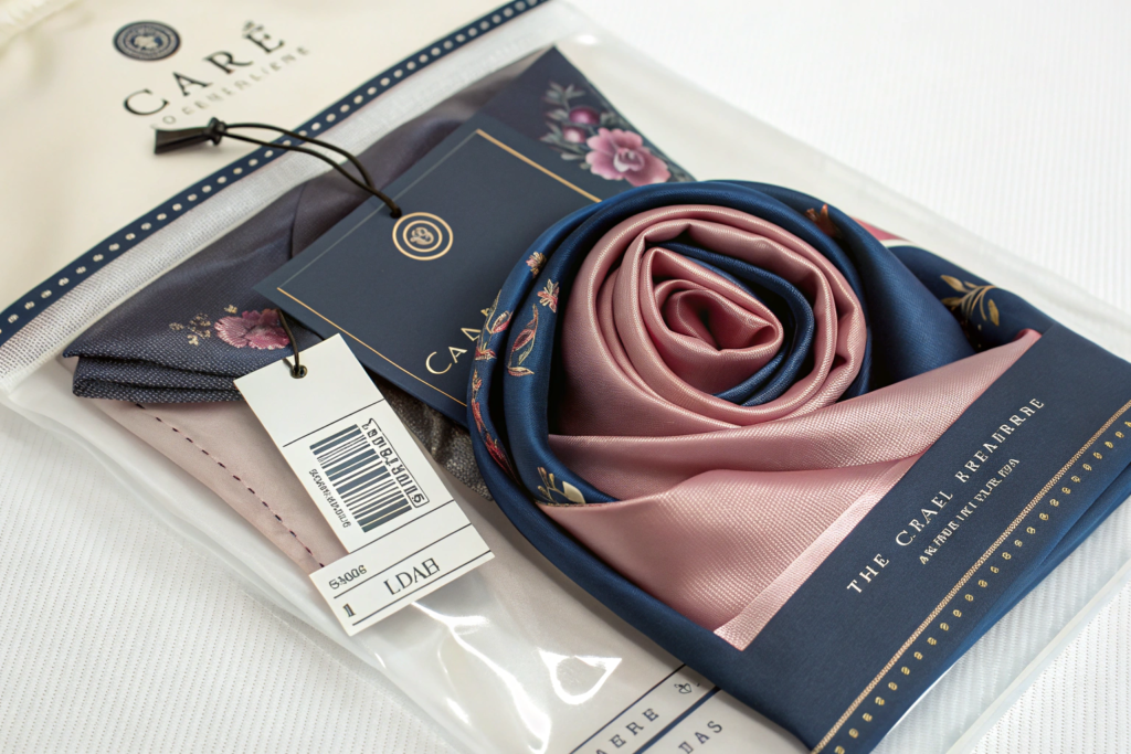5. Care and Content Label: Permanently attached (sewn-in for scarves, glued for hard goods), listing material composition and washing instructions.