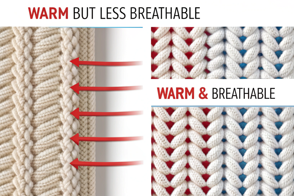 • Cable Stitches: These cross stitches over each other, physically pushing the fabric outward. This creates a thick, warm fabric, but the raised cable itself and the recessed background create a landscape that allows for more air movement across the surface than a flat fabric of the same thickness.