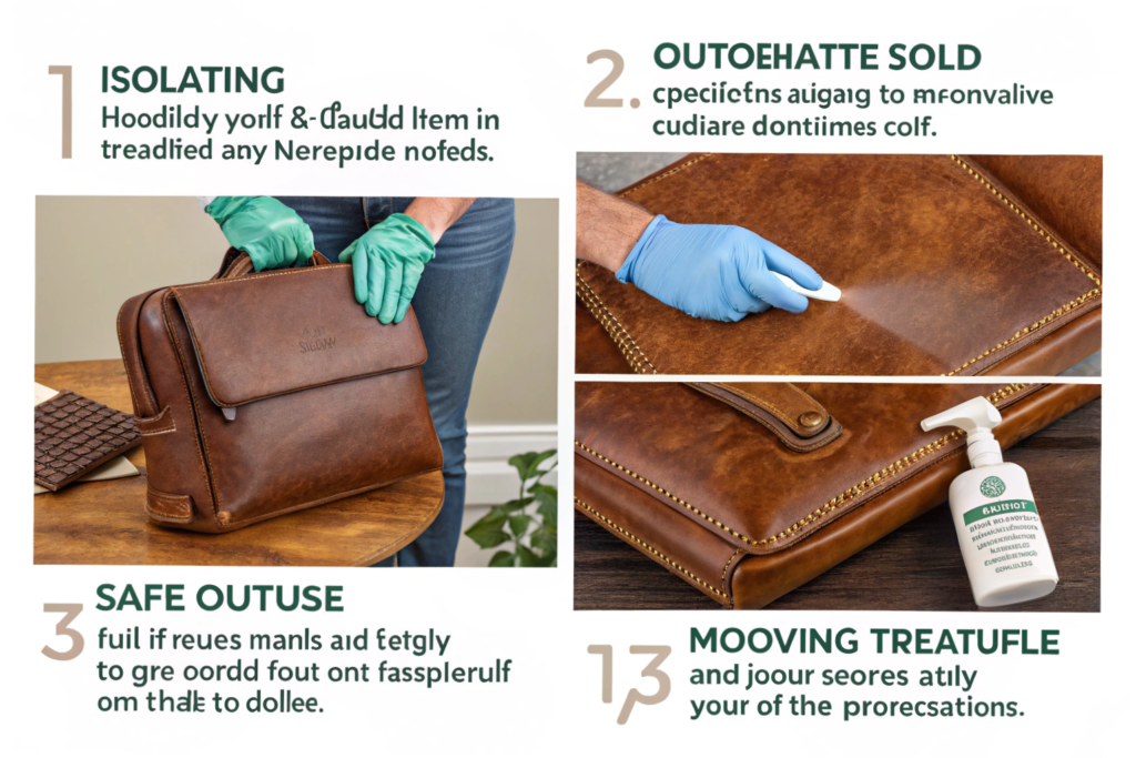 The first step upon discovering mold is to isolate the item, then gently remove surface spores outdoors before applying a dedicated leather-safe mold treatment. Severe cases may require professional intervention. It is a careful process, not a hasty one.