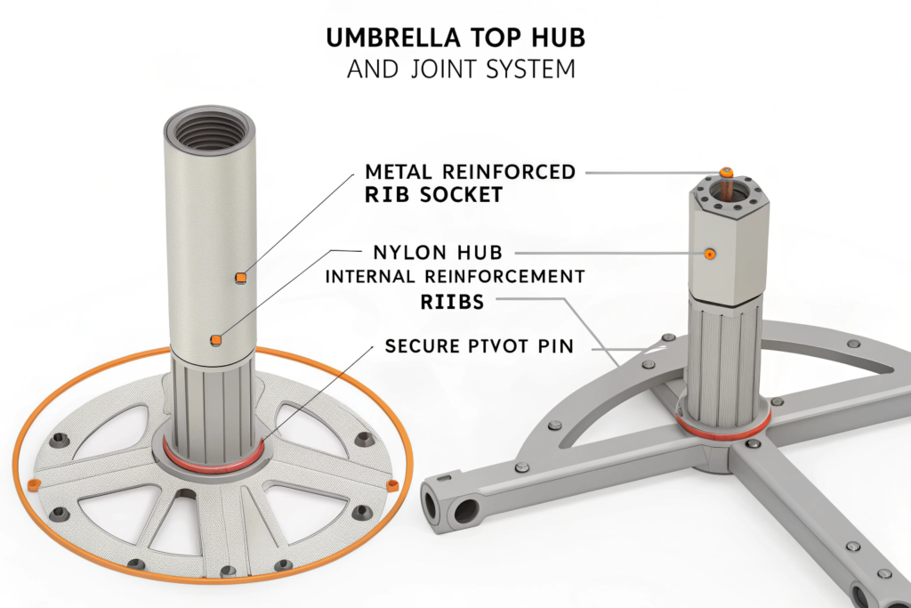A well-designed hub system is what allows an umbrella to be opened and closed thousands of times without failure. It's a hallmark of quality manufacturing.