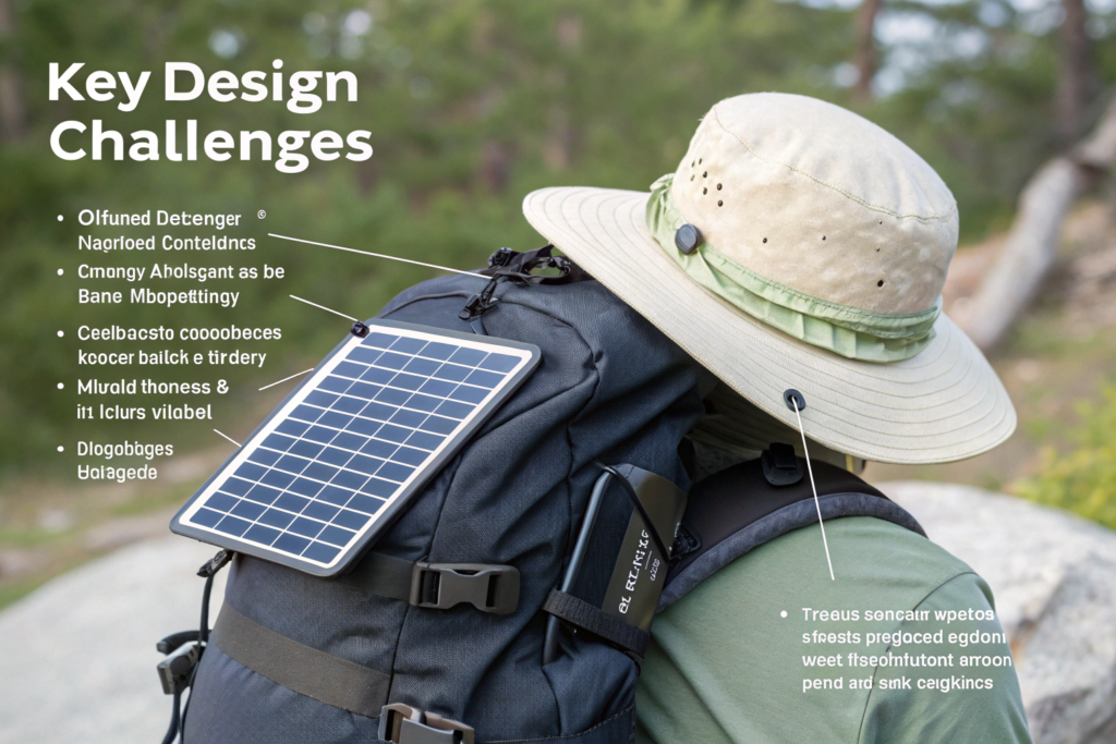 The key design challenges for solar accessories are panel placement for optimal sun exposure, weight and balance for user comfort, and weatherproofing for durability. The solar panel needs to be positioned where it will actually see the sun, which is often on the top of a hat brim or the front of a backpack. But this placement affects the look of the product and can make it top-heavy. The electronics add weight, so you must balance the product to avoid discomfort. And every seam, every pocket, and every port must be designed to keep water out. Solving these challenges requires close collaboration between the design team and the engineering team from the very first sketch.