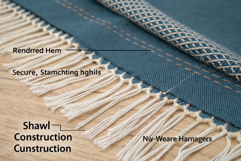 Superior construction addresses common failure points in travel shawls, particularly edges, corners, and areas subject to frequent handling or compression during packing.