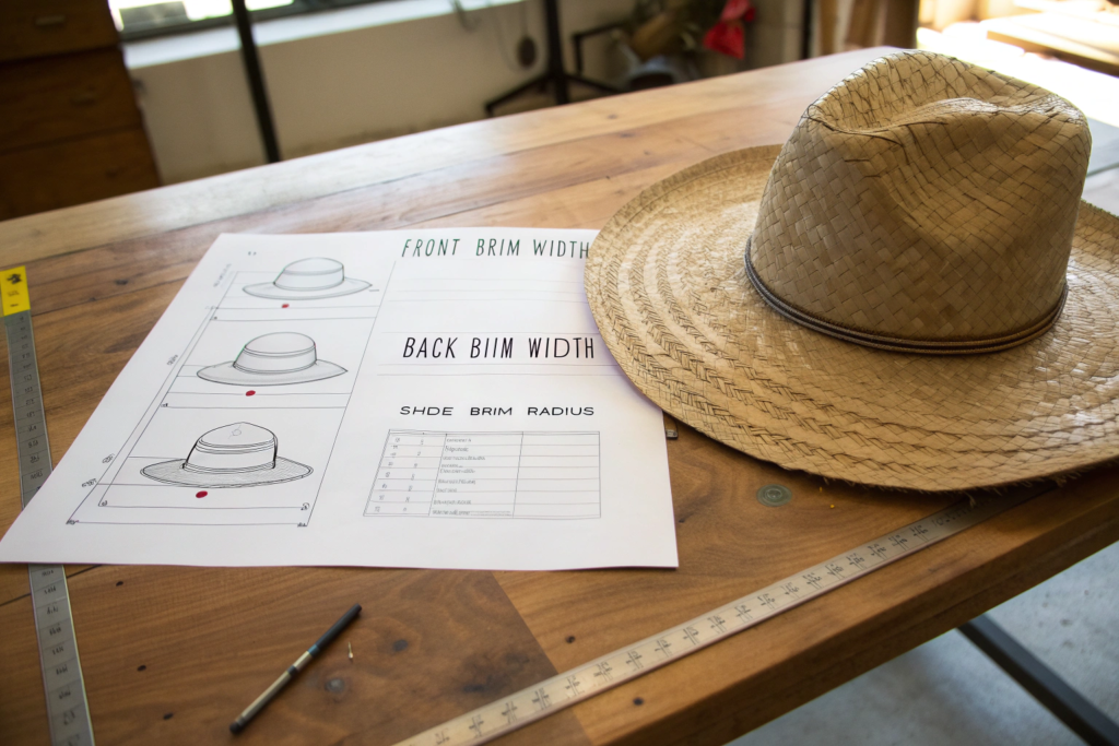 I want to share how we communicate with clients. We use a brim specification sheet. It has diagrams showing the different measurements. Front width. Back width. Side width. Brim curve radius. Brim angle. Edge type. The client fills it out or marks up a photo. This eliminates guesswork. It ensures that we are both imagining the same hat. This brim specification sheet has been invaluable.