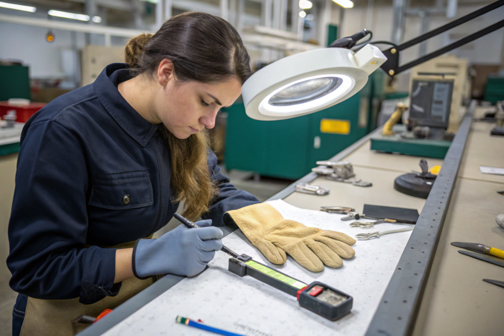 The third check is after assembly. Each glove is inspected. The lining is checked. The stitching is checked. The fit is checked.