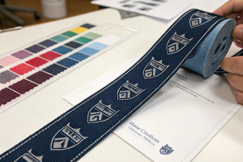 The process is straightforward. You provide us with the school logo or crest. Our design team converts it into a weave file. We produce a digital loom proof showing exactly how the logo will render in thread. Once approved, we weave a 10-yard strike-off sample for final physical approval. This ensures the colors match the uniform exactly under different lighting conditions. This is how we ensure the quality and accuracy of custom work.