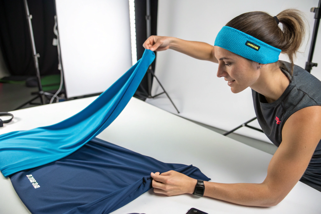 Nylon spandex is ideal for activewear headbands because it has excellent recovery. It stretches up to 100% and returns to shape. It does not bag out. It also wicks moisture. It pulls sweat away from the skin. It dries quickly. Nylon spandex is durable. It resists pilling. It holds color. For high-yield production, nylon spandex cuts cleanly. It sews well. It is available in large rolls. The main downside is that it is less breathable than cotton. But for activewear, it is the best choice.