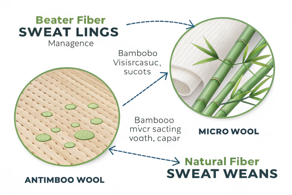 The best natural fiber lining for sweat management is bamboo viscose. Bamboo fibers have natural micro-gaps and micro-holes that create capillary action. Moisture is drawn away from the skin and spread across the fabric surface. Bamboo also contains bamboo kun, a natural antimicrobial agent. It suppresses bacterial growth and odor. Merino wool is another excellent natural option. Wool absorbs moisture vapor without feeling wet. It regulates temperature. It is naturally odor-resistant. Both bamboo and merino outperform cotton significantly. They also cost more. They are worth the premium for customers who prioritize natural materials.