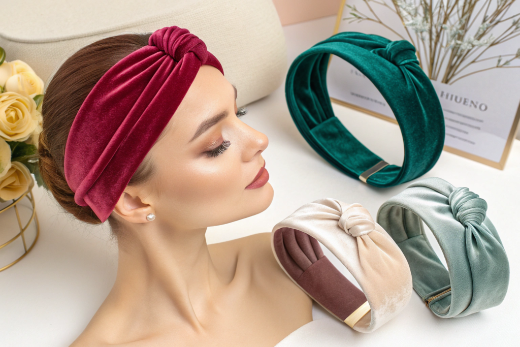 Velvet has a rich, luxurious appearance that elevates any outfit. It catches light beautifully and photographs well, which is important for online sales. It's soft against the skin and comfortable to wear. Velvet also has some natural grip because of its texture. In 2026, velvet headbands in jewel tones like emerald, sapphire, and ruby are particularly popular. We source our velvet from specialty mills that produce consistent, high-quality fabric.