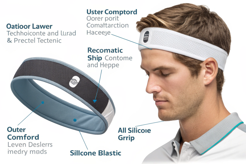 Silicone is the most common grip material. It's soft, flexible, and doesn't irritate skin. It can be applied in thin strips that are barely noticeable. Textured fabrics can also provide grip. Terry cloth inside a sport headband grips naturally. Ribbed knits have some grip. The key is distributing the grip evenly so no single point creates pressure.