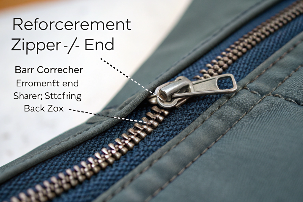The ends of zippers are subject to stress every time the zipper is opened and closed. Without reinforcement, the zipper tape can pull away from the fabric.