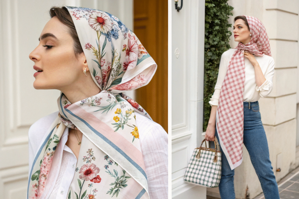 The essential scarves for spring are defined by their material and pattern. Silk, chiffon, and fine cotton are ideal for their breathability and fluid drape. In terms of design, floral prints, delicate gingham checks, and abstract watercolor patterns are perennial spring favorites. A large, square scarf offers immense versatility: it can be worn loosely around the neck, tied as a headscarf, or even knotted onto the handle of a bag as an accent.