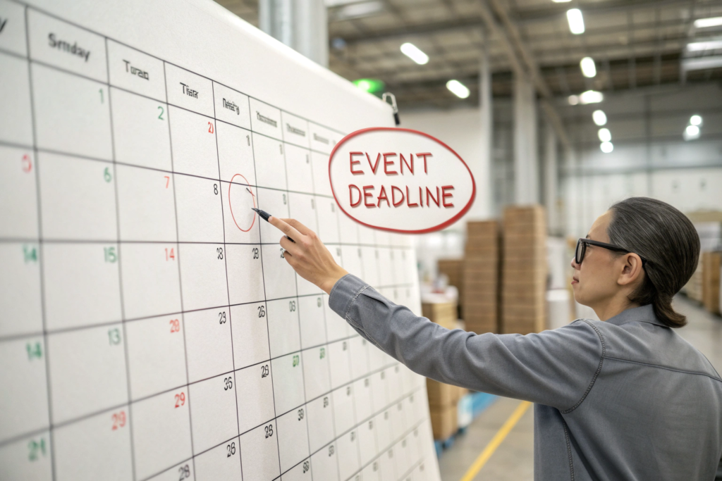 1. Build a 14-Day Buffer: Whatever the factory tells you the delivery date is, add two weeks for customs delays, weather, or trucking issues. Tell the factory you need the goods in your warehouse two weeks before the event. This gives you breathing room.