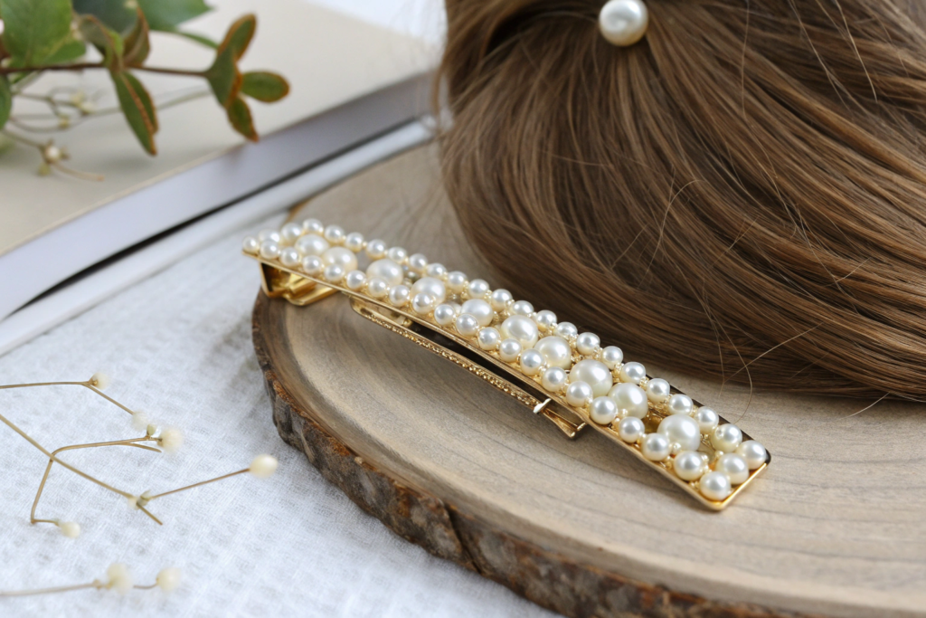 This style is not a bold statement piece. It is a quiet, elegant accent. It is often worn in pairs or sets of three, creating a composed, intentional look. Our orders for these embellished slim barrettes and matching hair pins have surged for the 2026 season. This embellished slim barrette and hair pin trend with freshwater pearls and mixed metals is a key direction for the boutique market.