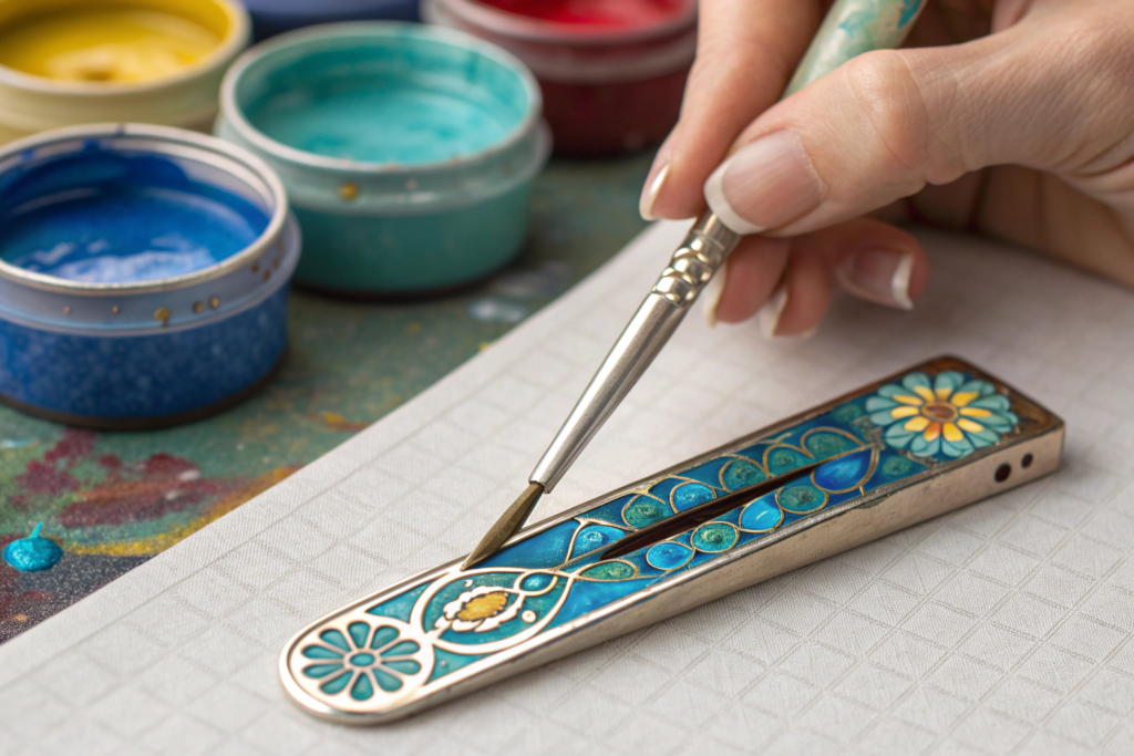 The modern, high-quality solution is to use enamel or epoxy resin inlays. This technique involves creating a hair clip with recessed areas (a "cavity"). These cavities are then carefully filled with liquid enamel or epoxy resin. The piece is then cured, often with heat or UV light, to harden the resin into a smooth, durable, and glossy surface that is perfectly flush with the surrounding metal. This is a far more durable solution than surface paint.