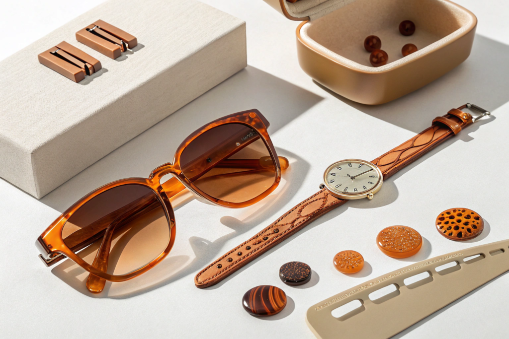 Injection-molded items work very well. Hair clips, sunglass frames, buttons, combs, and small jewelry pieces are ideal. These are items that need structure and consistency. Bioplastics flow well in molds and produce crisp details. For items that need flexibility, like certain types of hair bands, blended materials work better. We help clients select the right applications for bioplastics based on their specific requirements.