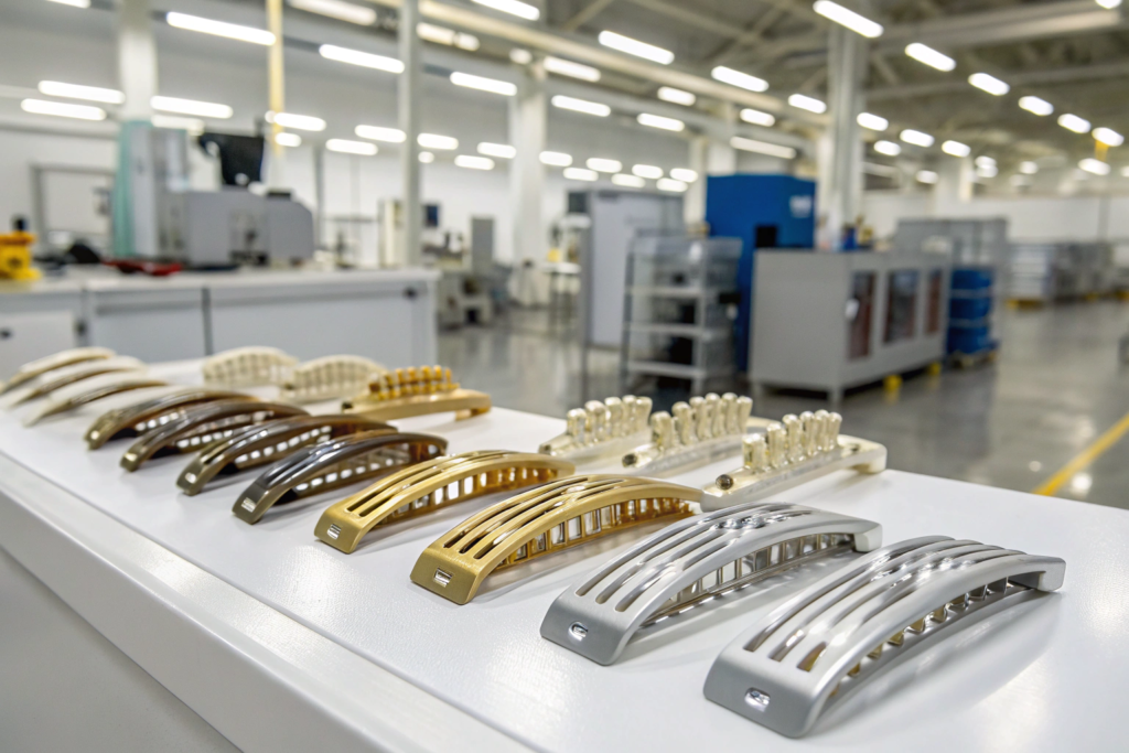 Vacuum metalizing is the key technology that makes plastic look like metal. The process starts with injection-molded plastic parts. These parts are cleaned thoroughly to remove any oils or contaminants. Then they are placed in a vacuum chamber. The chamber is evacuated, removing all air. A metal, typically aluminum, is heated until it vaporizes. The vapor travels through the chamber and condenses on the surface of the plastic parts, forming a thin, uniform metal layer. The result is a part that has the appearance of solid metal but weighs a fraction as much. After metalizing, the parts are usually coated with a clear top coat to protect the metal layer from scratching or tarnishing. This top coat can be gloss or matte, depending on the desired finish. The final product can be polished, antique, or colored. We have used vacuum metalizing for many projects. It is ideal for creating large, sculptural elements on headbands or clips. For example, a headband with a large, ornate floral design would be too heavy in solid metal. In molded plastic with vacuum metalizing, it is lightweight and comfortable. The molded plastic hair clip can make a bold statement without sacrificing wearability.