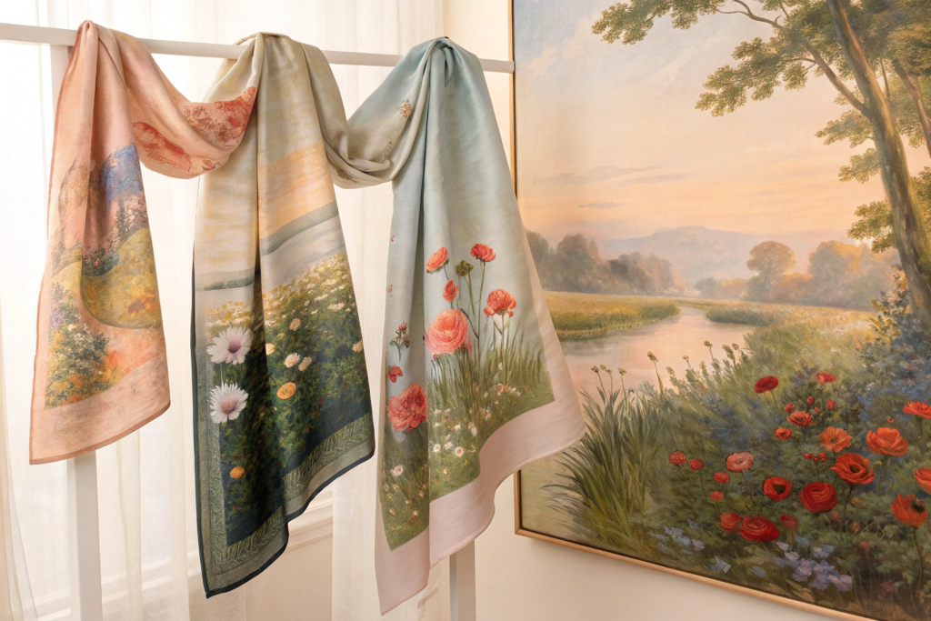 This is the challenge. A landscape painting is designed to be viewed from a distance. A scarf is worn close to the face. The composition must work at both scales. We work with artists to create designs that are beautiful up close and read well from afar. The best designs have both detail and overall composition. This scaling technique is essential for successful landscape prints.