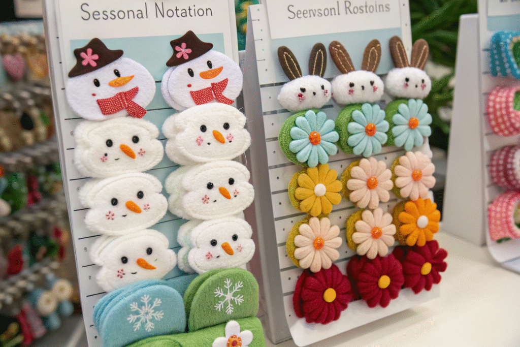 Seasonal plush hair ties capitalize on holiday excitement and changing weather patterns to create timely products that feel fresh and relevant throughout the year. These limited-availability styles often become collectible items that drive repeat purchases as seasons change.