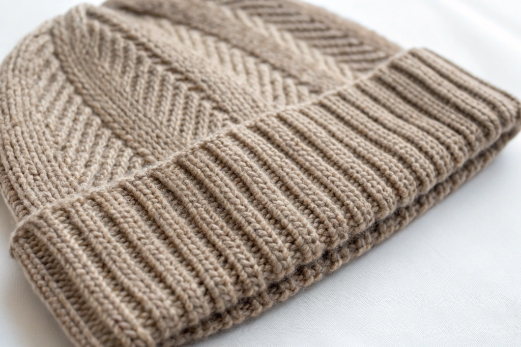 Gauge refers to the number of stitches per inch in the knitted fabric. A tighter gauge, more stitches per inch, creates a denser, firmer, and often warmer fabric. A looser gauge creates a more open, airy, and flexible fabric. The same yarn can produce very different beanies depending on the gauge at which it is knitted. We work with our clients to develop the optimal gauge for their desired hand feel and performance. This impact of knitting gauge on fabric density hand feel and warmth of beanies is a technical detail that we manage to achieve the perfect result.