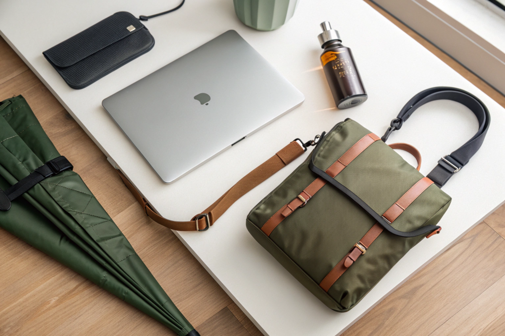 The umbrella bag is the surprise top seller in functional accessories for 2026. It is a fabric sleeve, often matching the umbrella canopy. You put your wet umbrella inside before entering a store, restaurant, or office. No dripping water. No wet floors. No plastic bags. The second top seller is the belt bag worn crossbody, not around the waist. Third is the reusable bottle carrier strap, converting any bottle into a crossbody sling.