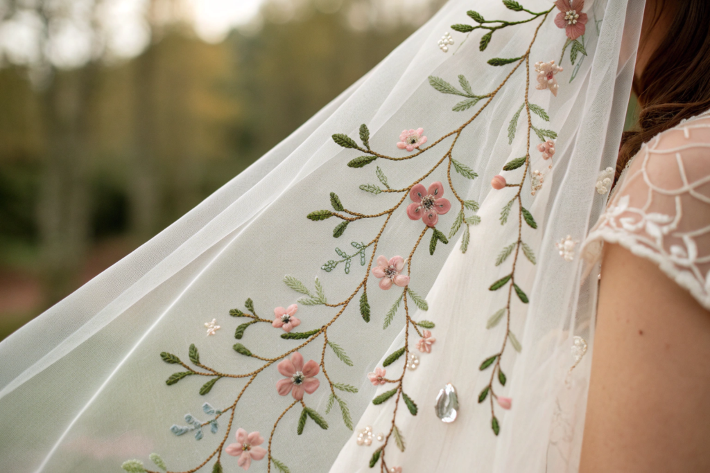 - Botanical Hues: Veil edges or embroidery in soft sage green, dusty blue, or pale blush to match wedding florals.