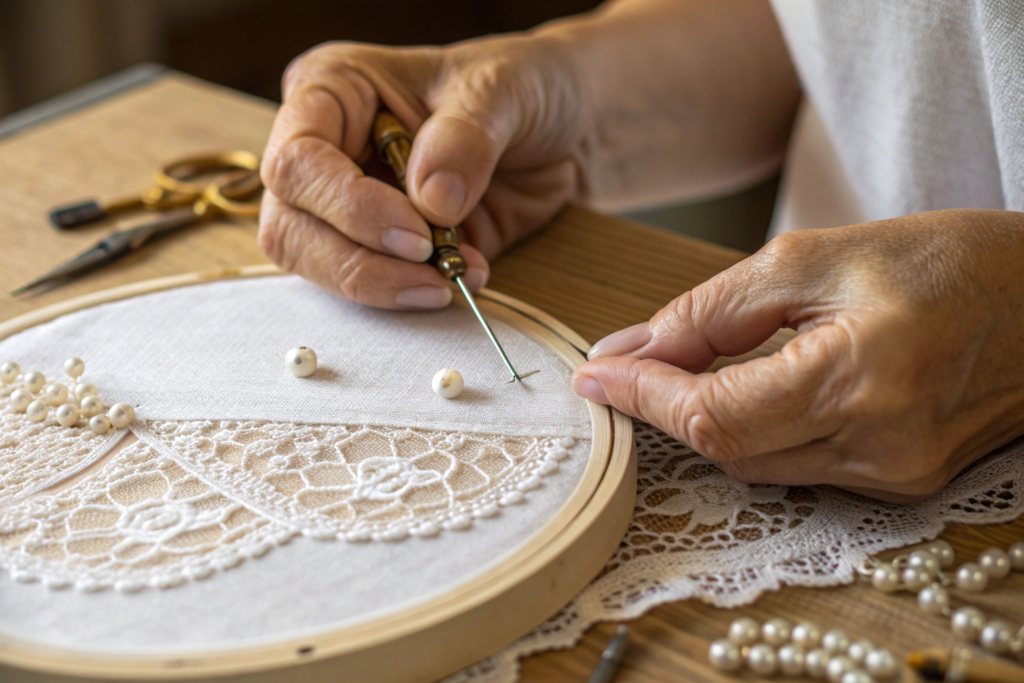 Look for signs of handwork: slight, beautiful irregularities in beading, the gentle roll of a hand-finished edge, and the presence of techniques like French wire work or needle lace fillings. Mass-produced pieces often have a perfect, hard uniformity, while artisan pieces have a soft, human quality.