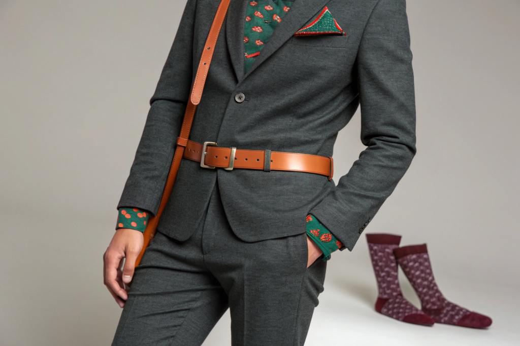 The trend is about curated accents, not head-to-toe color. A charcoal grey outfit can be elevated with a terracotta leather belt, a forest green pocket square, or socks in a heathery plum. This approach feels modern, confident, and creatively engaged. For accessory makers, it means expanding color offerings within neutral families and mastering small-scale, elegant patterns.
