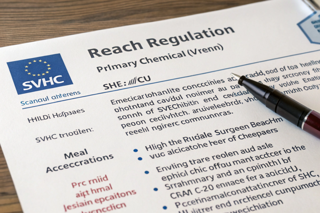 REACH (Registration, Evaluation, Authorization, and Restriction of Chemicals) is the primary chemical regulation in the European Union. It applies to all products sold in the EU. Under REACH, manufacturers must ensure that their products do not contain Substances of Very High Concern (SVHC) above certain limits. The SVHC list is updated regularly, currently containing over 200 substances. For accessories, common concerns include lead, cadmium, nickel release from metal components, and certain phthalates in plastics. Compliance requires testing by an accredited lab and maintaining documentation.