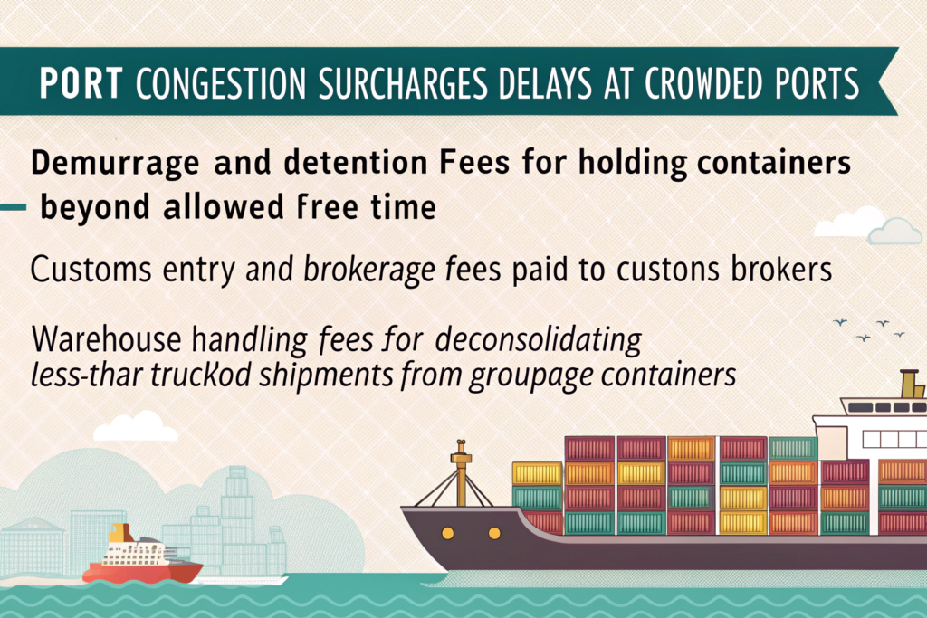 - Port Congestion Surcharges: Fees for delays at overloaded ports.