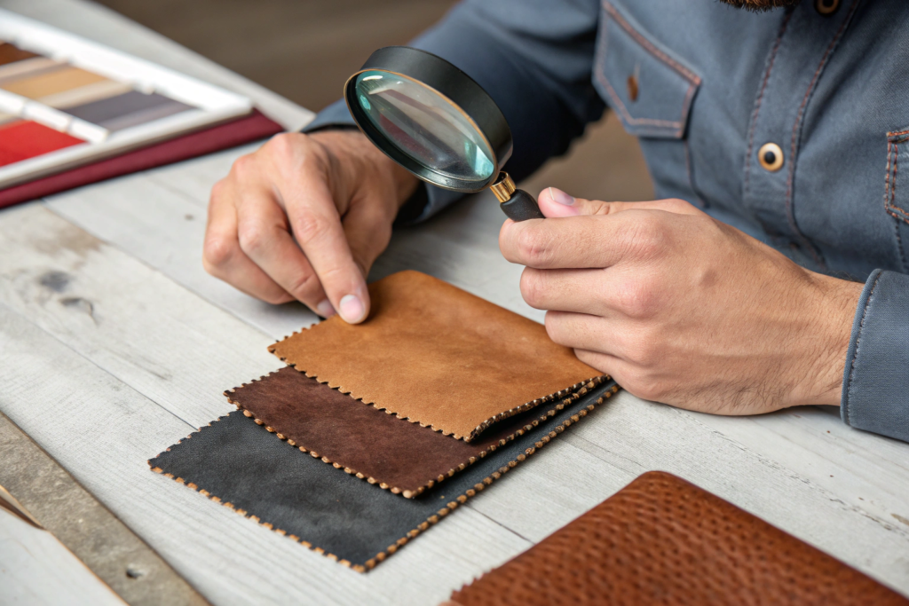 - Creases: Bend the material. Genuine leather will show smaller, more natural-looking creases. Bonded leather may form larger, sharper creases, and you might see tiny cracks in the surface coating along the bend.