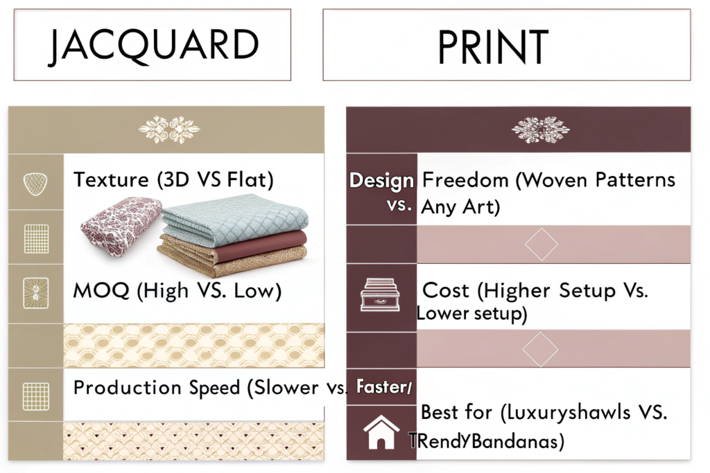 To make the best sourcing decision, you need to see them side-by-side. Each method excels in different areas, and your product's purpose should guide your choice. Choosing print for a heritage-style wool scarf might make it feel insubstantial, while choosing jacquard for a trendy, photo-based design would be prohibitively expensive and technically limited.