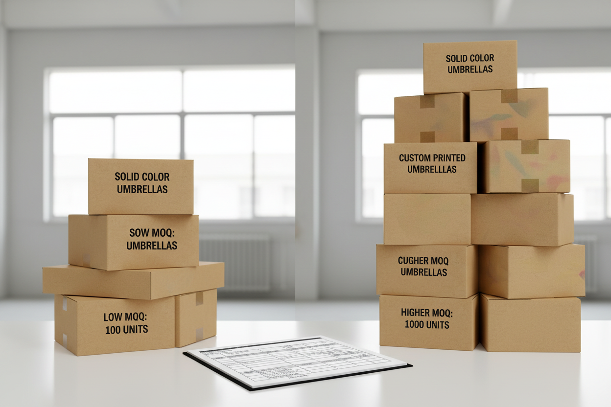 You have a great idea for a branded umbrella. Your logo is a beautiful, full-color illustration of a mountain landscape. You want it printed across the entire canopy of a folding umbrella. You email a factory on Alibaba for a quote. You ask for 300 units. The factory replies: "MOQ for custom print is 1000 pieces." You ask if you can just order 300 solid color umbrellas and add your logo later. The factory says: "MOQ for solid color is 500 pieces." You are frustrated. You are a growing brand, not a big-box retailer. You need to understand the economics driving these different minimums so you can plan your order realistically and find a supplier who can work with your scale.